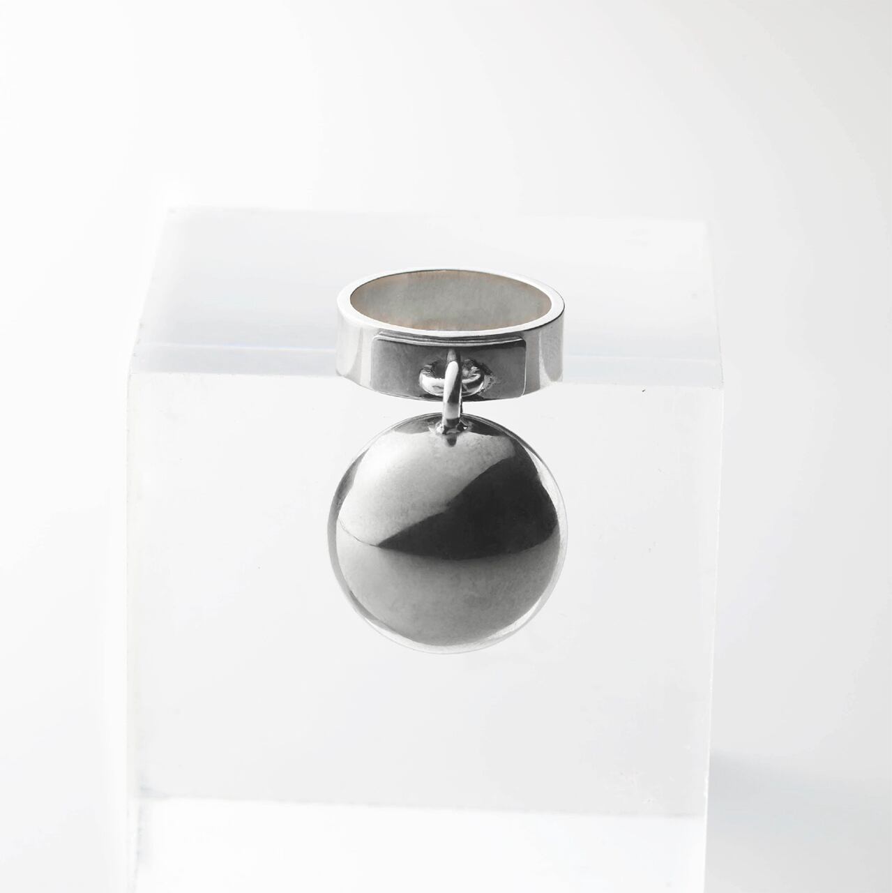 リングにセットした球体のモチーフが揺れる、インパクト大のリングです。