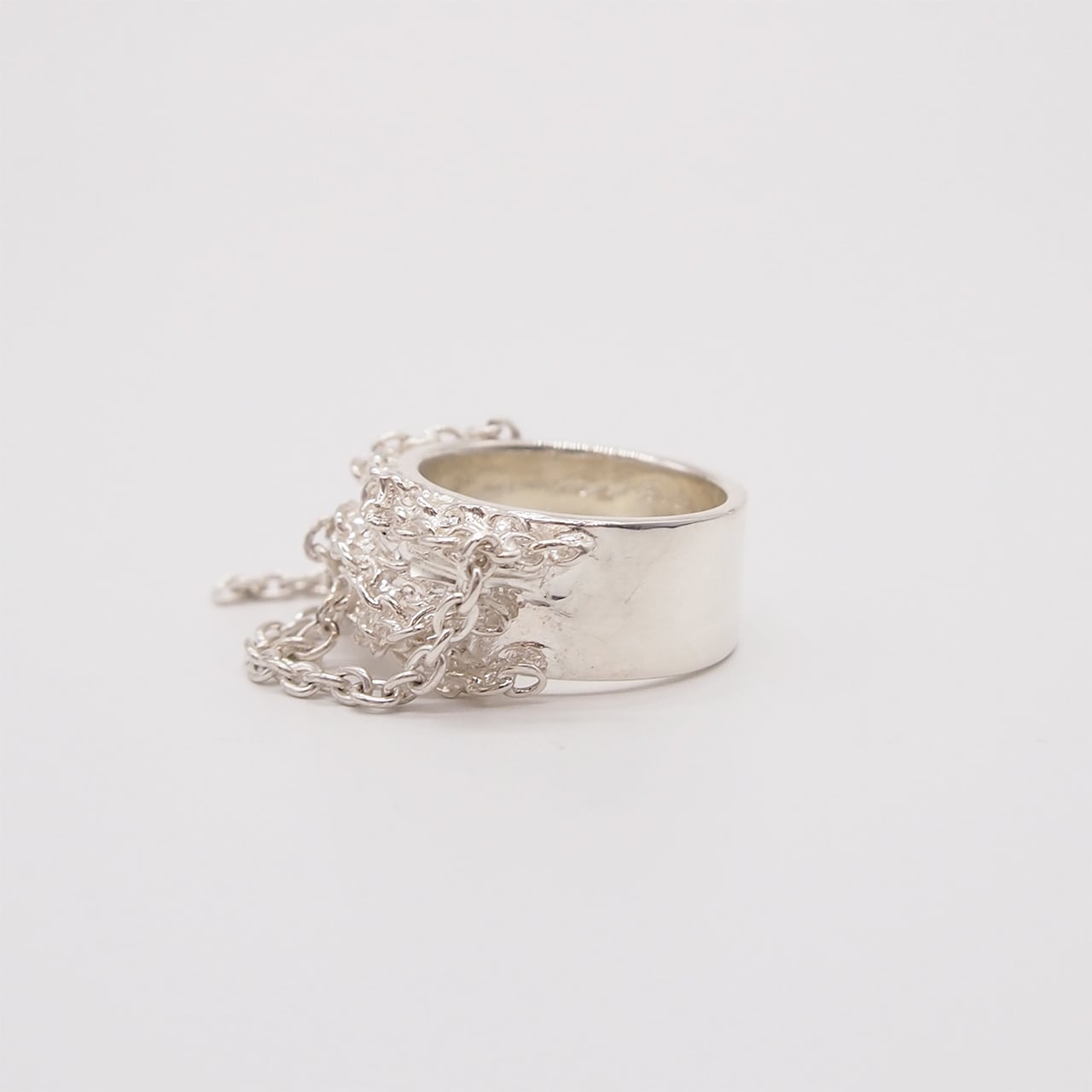 一部のチェーンが可動するようになっており、手を動かすたびにチラチラと可動チェーンが動くインパクト大のリングです。