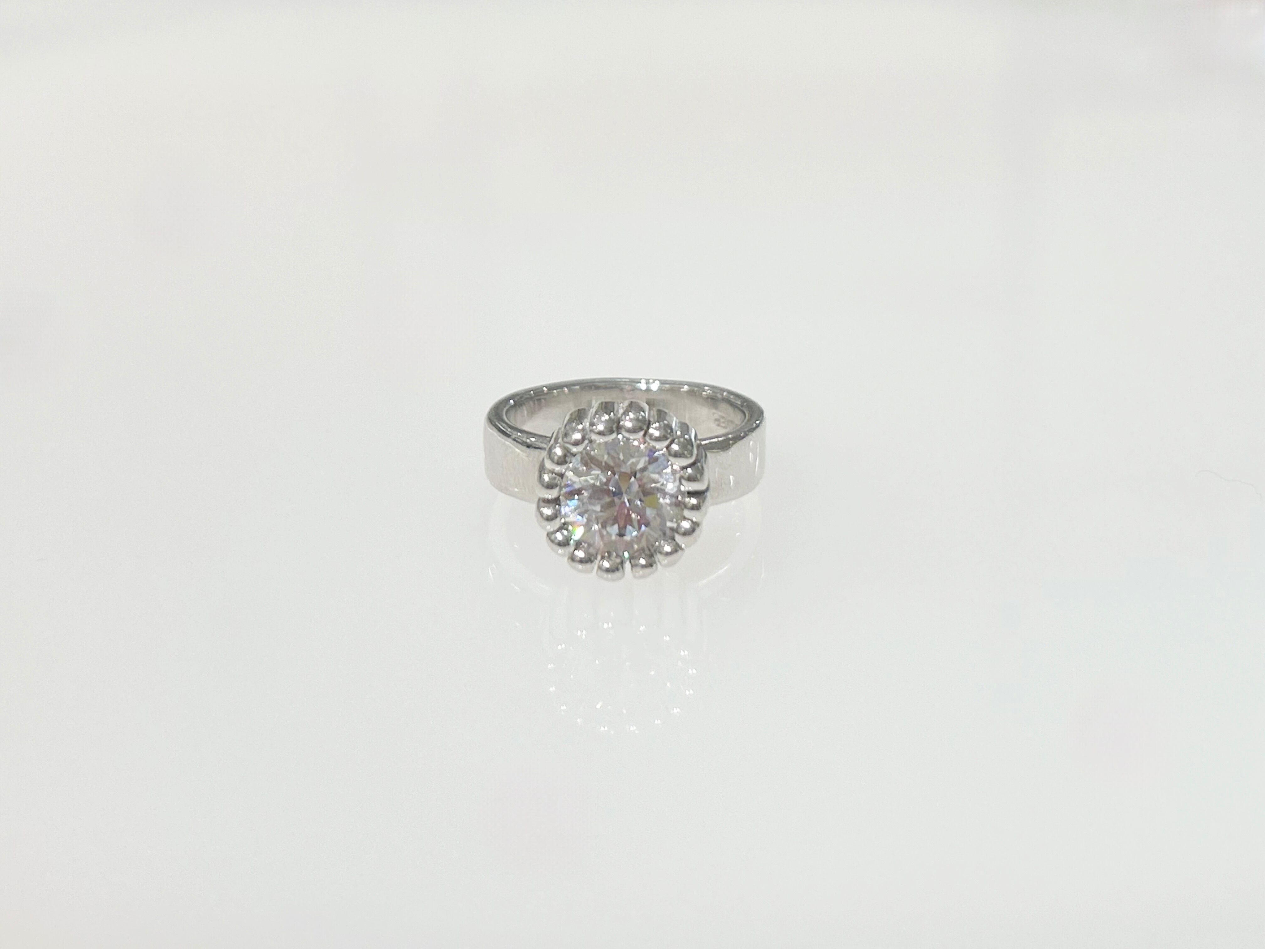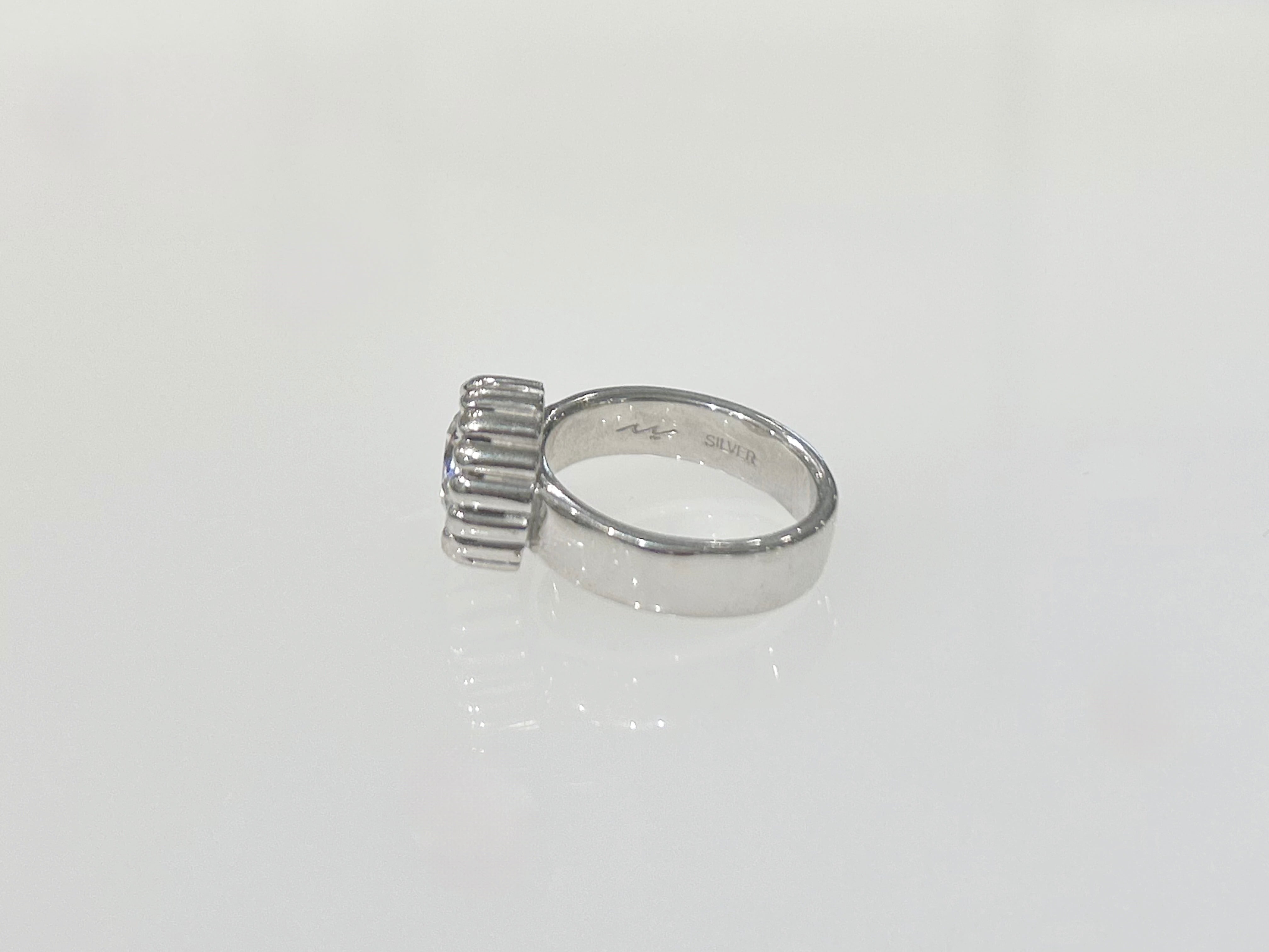 わざとらしく大きな石座にジルコニアをセットし、シルバー部分もロジウムコーティングを施し白っぽく、おもちゃのような質感を表現しています。